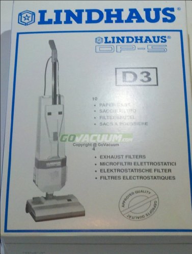 Genuine Lindhaus Type D3 Paper Bags to keep your Lindhaus upright performing well. This box contains ten high filtration paper bags plus four Filtrete exhaust filters. The 3 quart paper bags are designed for the Lindhaus DP-5 (not HEPA) and DP-5 Evolution series uprights. These uprights have a tube along the left side inside the bag chamber. The Filtrete exhaust filters measure 3 1/16" x 2 3/8" and fit in frames on the sides of the vacuum's main body. Product Code: 030310019